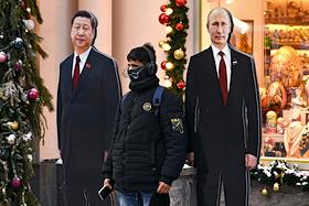 Жанровая фотография. Молодой человек фотографируется у картонных фигур председателя КНР Си Цзиньпина…