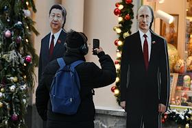 Жанровая фотография. Молодой человек фотографирует картонные фигуры председателя КНР Си Цзиньпина и…