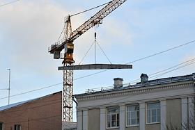 Жанровая фотография. Подъемный кран с бетонной плитой на стройке.