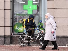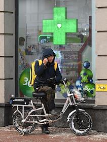 Жанровая фотография. Курьер службы доставки "Яндекс. Еда" на фоне витрины аптеки.