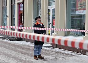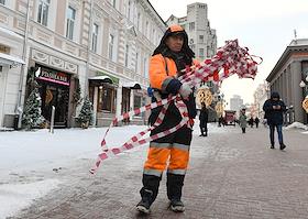 Жанровая фотография. Сотрудник коммунальных служб сматывает заградительную ленту на Арбате.