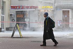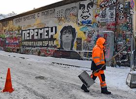 Жанровая фотография. Дворник с лопатой для уборки снега на фоне "Стены Цоя" на Арбате.