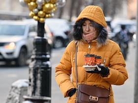 Жанровая фотография. Женщина с бумажными стаканчиками с напитками на улице.