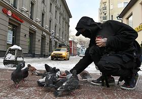 Жанровая фотография. Молодой человек кормит голубей на Арбате.