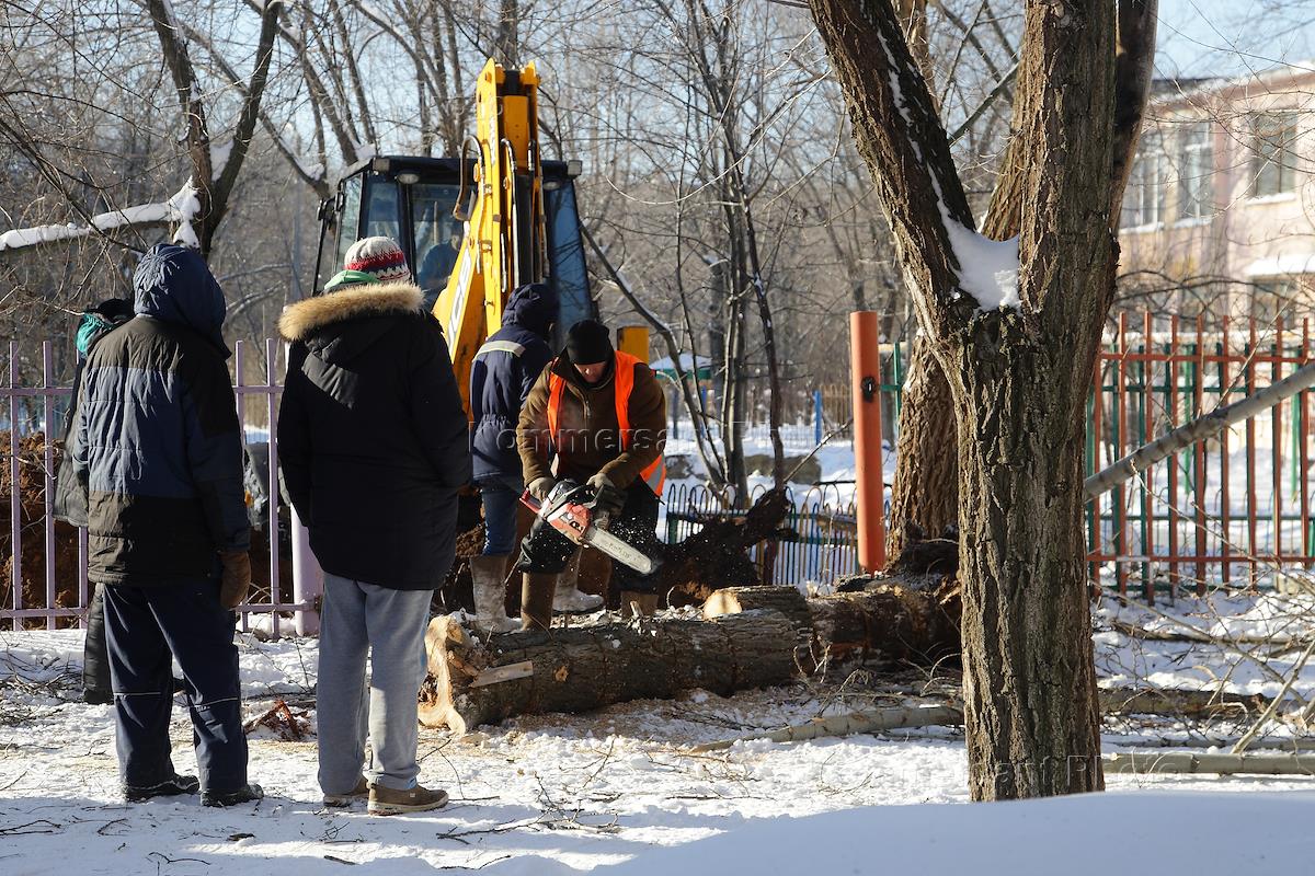 Работа спецтехники на коммунальных сетях города. Сотрудники во время обрезки сухих деревьев.