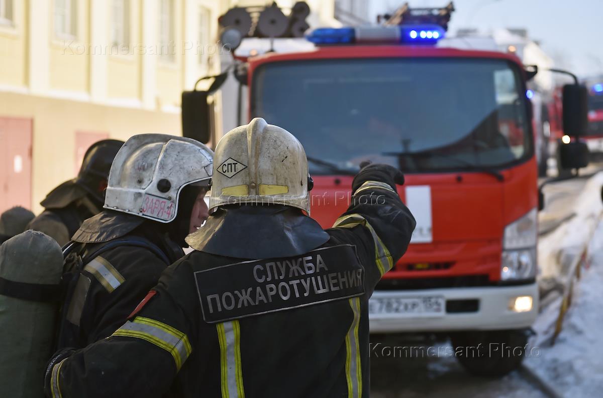 Сотрудники пожарной охраны МЧС России во время ликвидации возгорания в подвальном помещении гимназии…