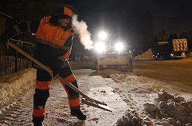 Жанровая фотография. Сотрудник коммунальных служб города во время уборки снега на улице.