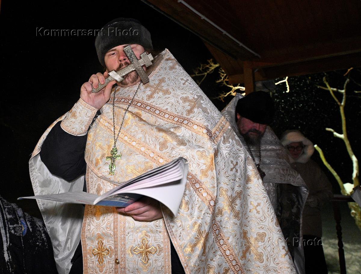 Праздник Крещения Господня. Крещенские купания в проруби пруда в усадьбе Сенницы. Священнослужитель…