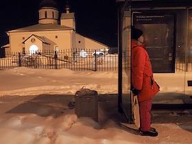 Праздник Крещения Господня. Жанровая фотография. Женщина на остановке общественного транспорта у…