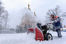 Виды Петергофа после снегопада. Жанровая фотогарфия. Уборка снега у Петергофского собора святых…