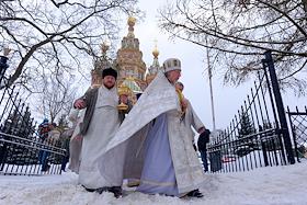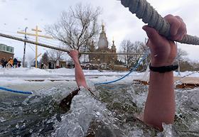 Праздник Крещения Господня. Крещенские купания в Ольгином пруду у Петергофского собора святых апостолов Петра и Павла.
