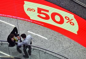 Жанровая фотография. Торговый центр "Щёлковский". Посетители в центре. Вывеска с надписью "до 50%".