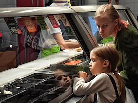 Жанровая фотография. Торговый центр "Щёлковский". Покупатели у стойки с едой на фуд-корте центра.