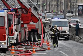 Пожар в здании Театра Сатиры на Триумфальной площади. Сотрудники пожарной части МЧС России во время…