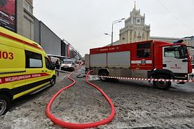 Пожар в здании Театра Сатиры на Триумфальной площади. Автомобили пожарной части МЧС России на месте…