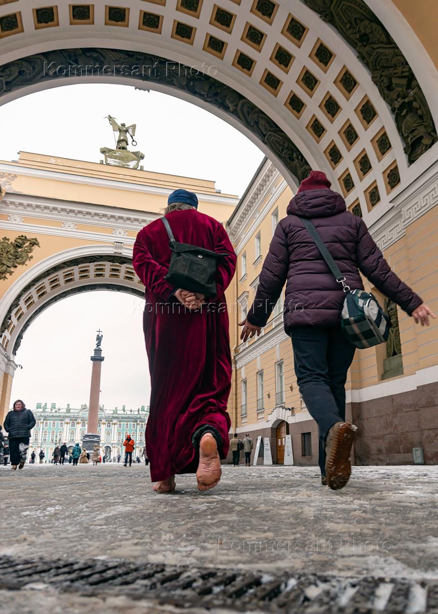 Жанровая фотография. Мужчина с босыми ногами идет по улице в арке Генерального штаба.