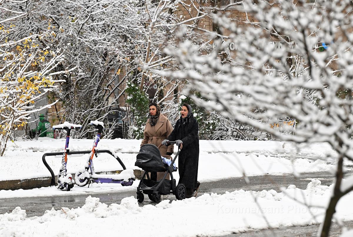 Жанровая фотография. Снегопад в городе. Женщина с коляской во время прогулки под снегом на улице.
