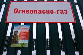 Жанровая фотография. Рекламный плакат контрактной службы в армии и табличка "Огнеопасно - газ" на…