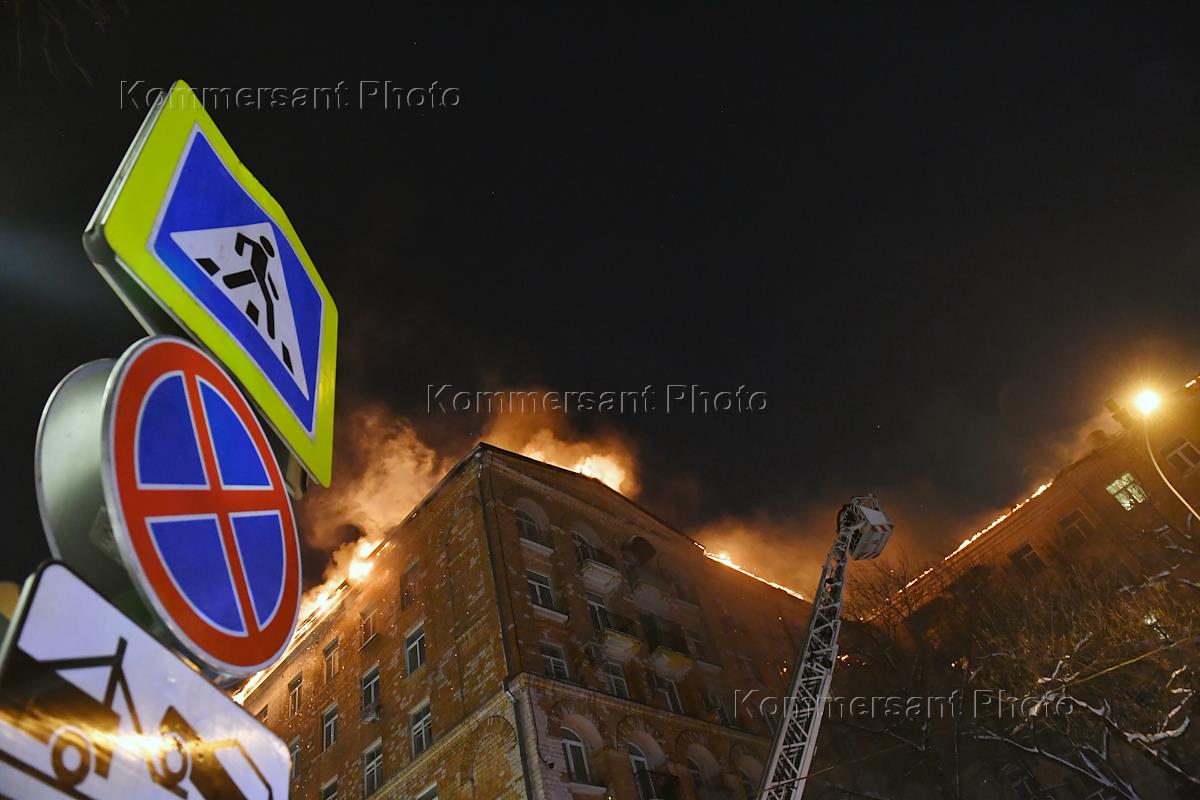 Пожар в шестиэтажном жилом доме на улице Черняховского возле метро "Аэропорт". Площадь пожара кровли…