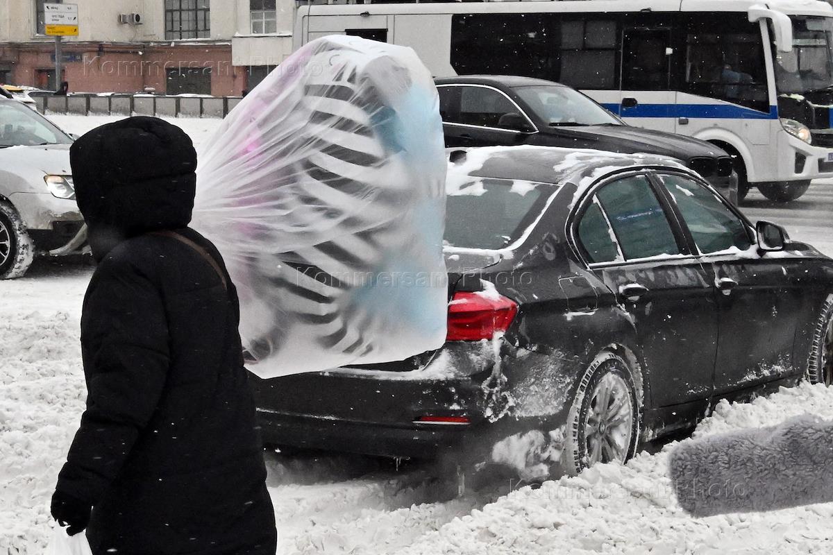 Виды Москвы во время снегопада. Жанровая фотография. Водитель в заснеженном автомобиле.