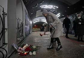 Стихийный мемориал в подземном пешеходном переходе на Плотинке в связи со смертью Алексея Навального.