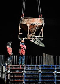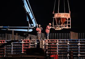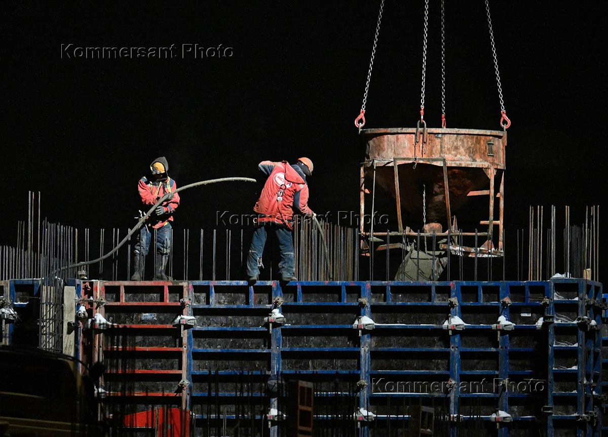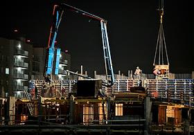 Строительная площадка жилого дома. Ночная заливка бетона.