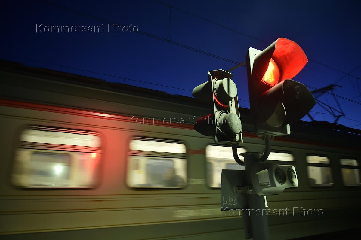 Жанровая фотография. Электропоезд проезжает железнодорожный переезд.