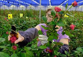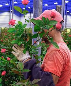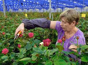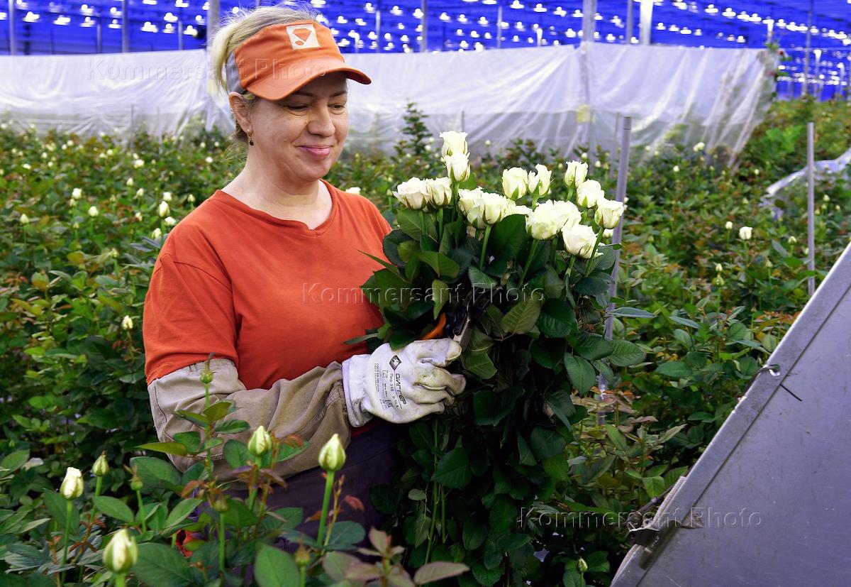 Тепличный комплекс "Новая Голландия" по выращиванию роз. Сотрудница во время сбора роз.