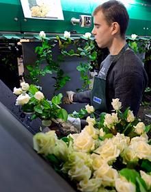 Тепличный комплекс "Новая Голландия" по выращиванию роз. Сотрудник во время сортировки и упаковки…