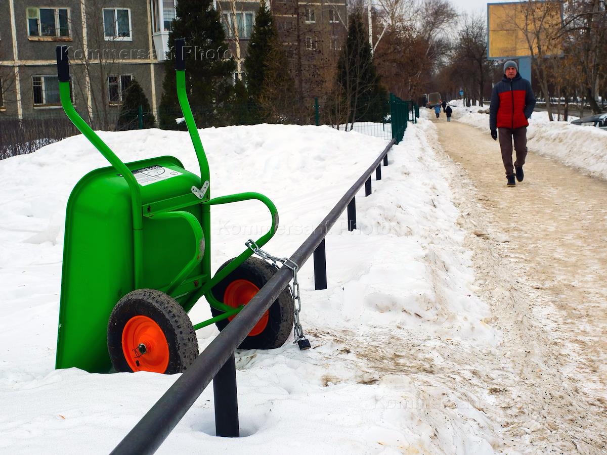 Виды Екатеринбурга. Жанровая фотография. Тачка, привязанная цепью к ограждению, в сугробе.