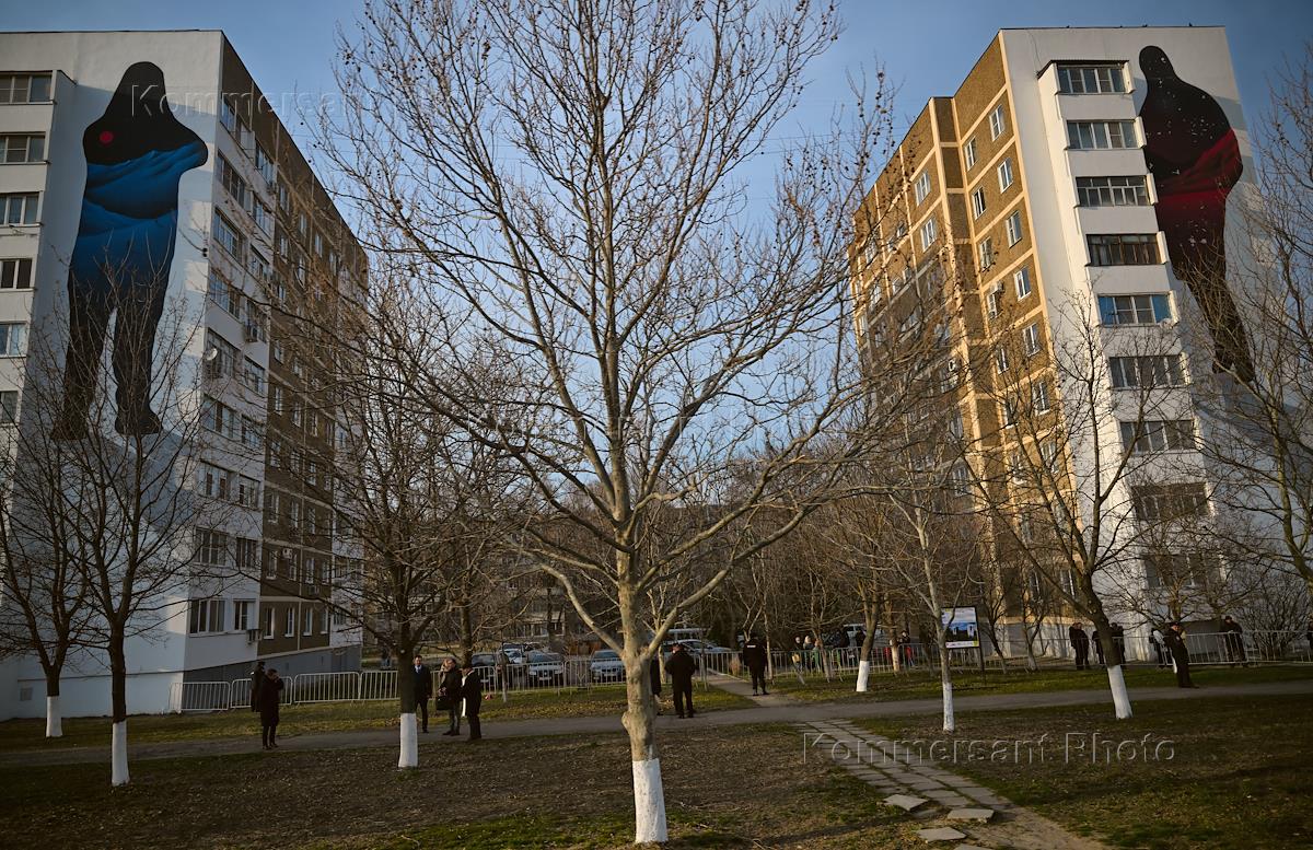 Рабочая поездка президента России Владимира Путина в Ставропольский край. Граффити на фасаде жилых…