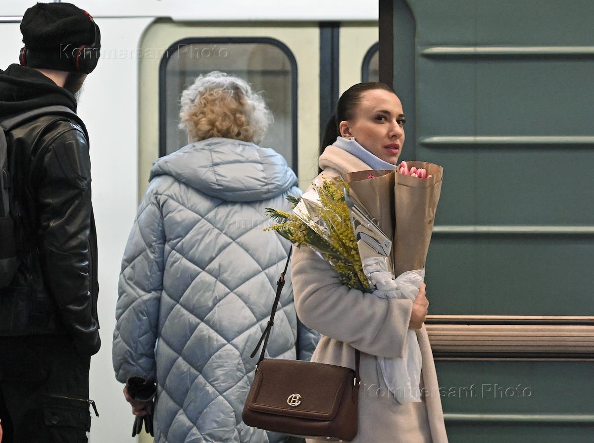 Жанровая фотография. Празднование Международного женского дня. Девушка с букетами цветов на станции…