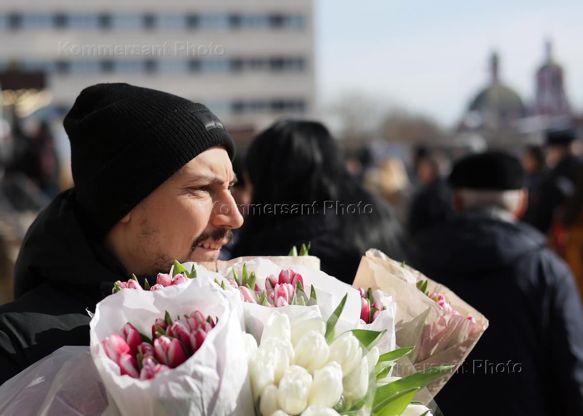 Подготовка к празднованию Международного женского дня. Жанровая фотография. Продажа цветов на…