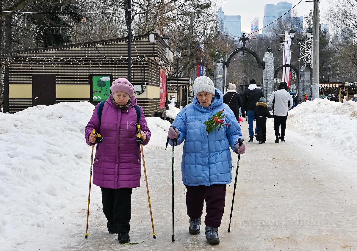 Празднования Международного женского дня 8 Марта. "Цветочный забег" в парке Фили. Пожилые женщины во…