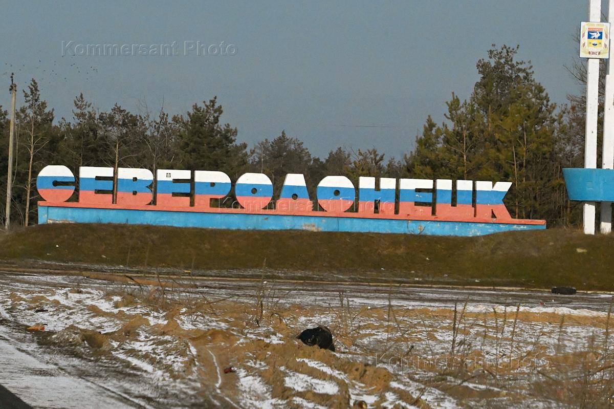Виды Северодонецка. Жанровая фотография. Стела "Северодонецк" в цветах флага России при въезде в…