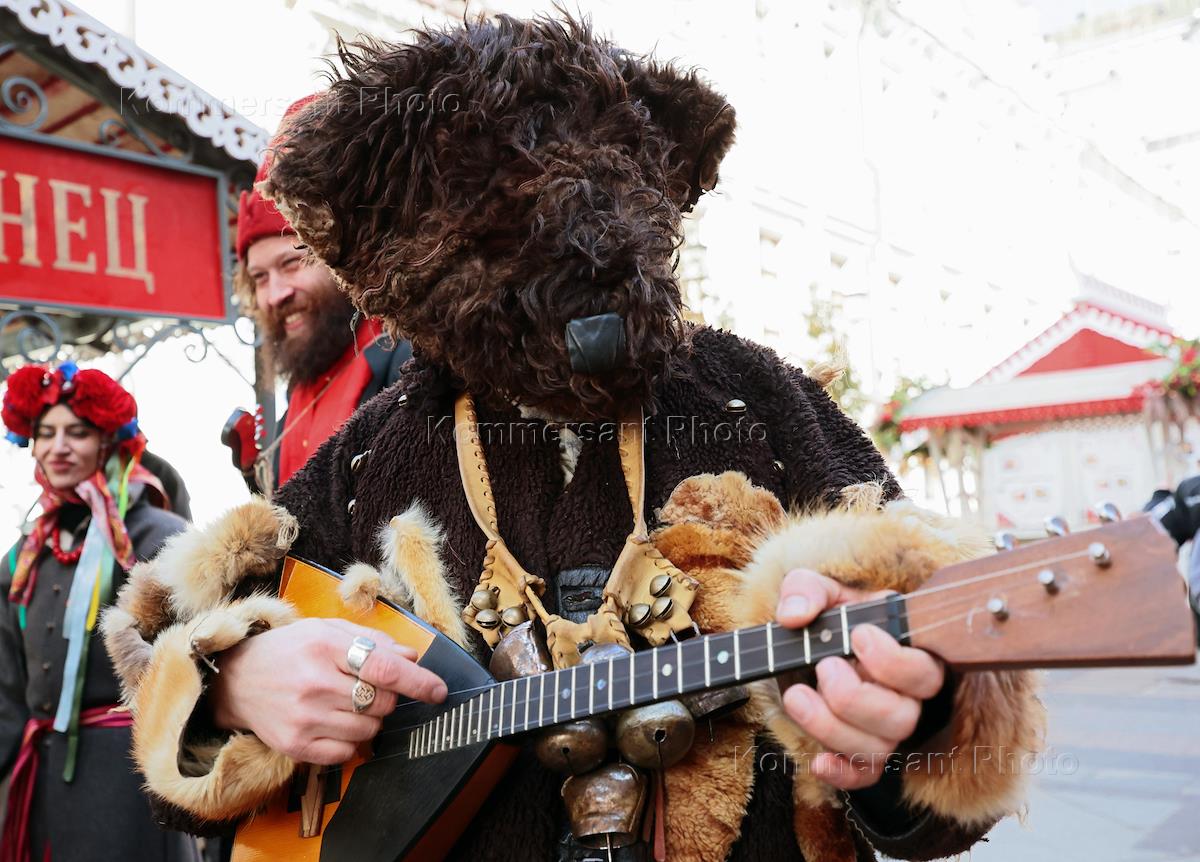 Фестиваль "Московская Масленица". Аниматор в костюме бурого медведя во время игры на балалайке…
