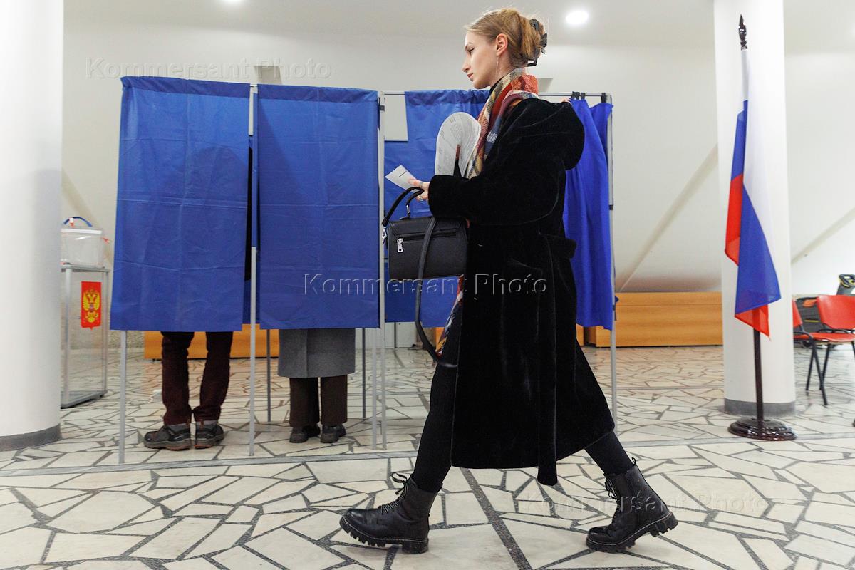 Выборы президента России. Избиратели во время голосования на избирательном участке.