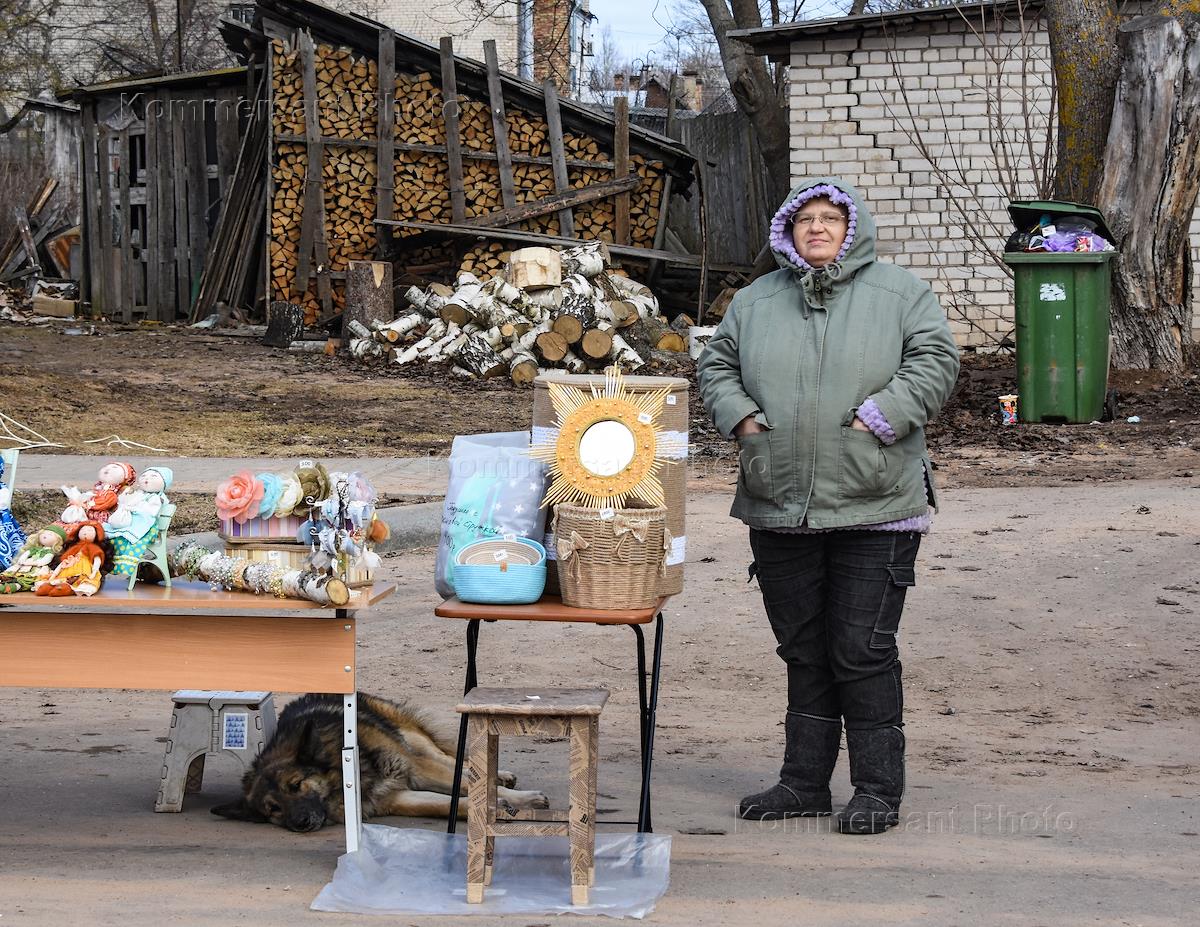 Виды Псковской области, город Гдов. Жанровая фотография. Женщина продает сувениры на улице.