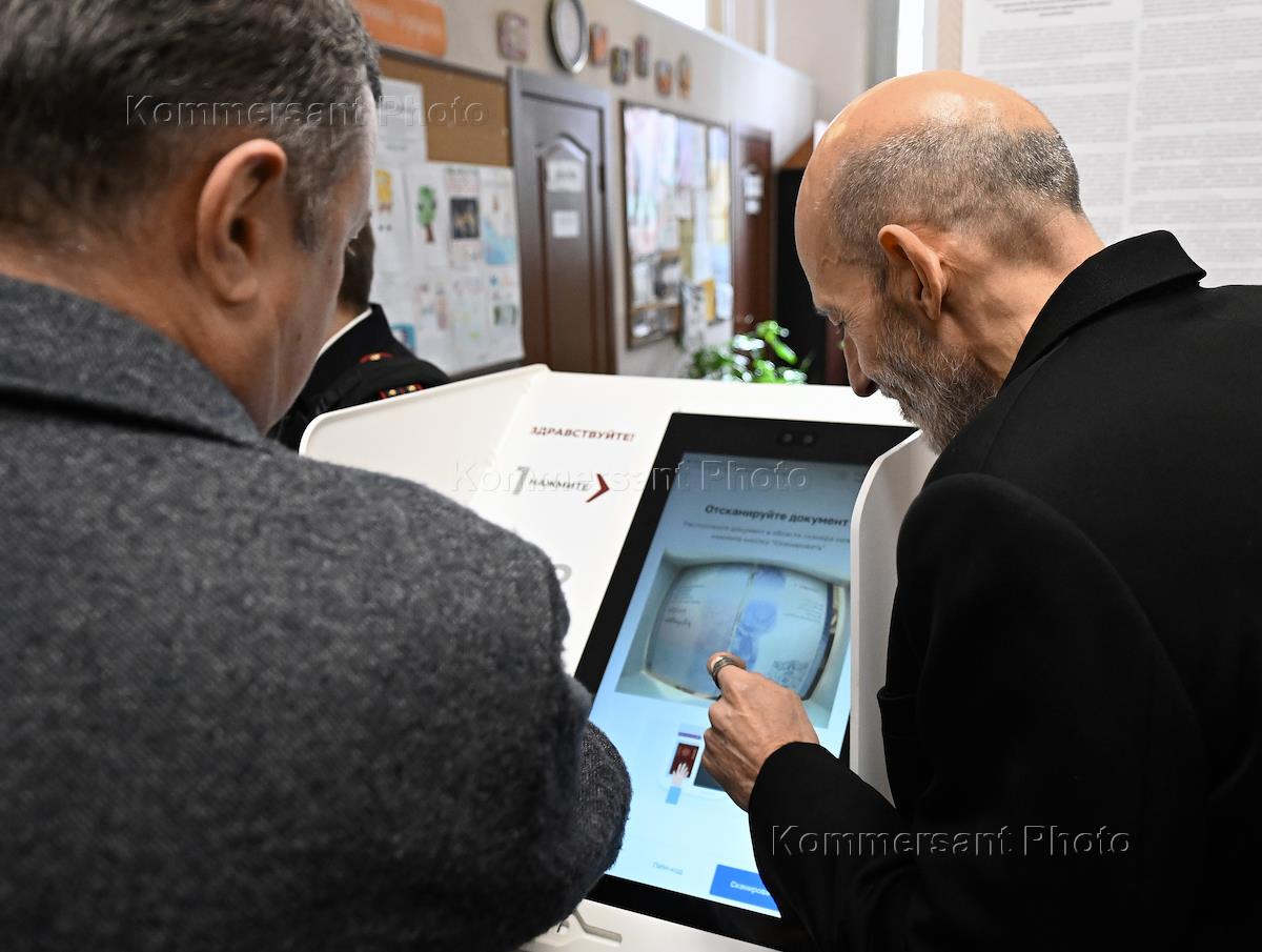 Выборы президента России. Избиратели у терминала для электронного голосования на избирательном…