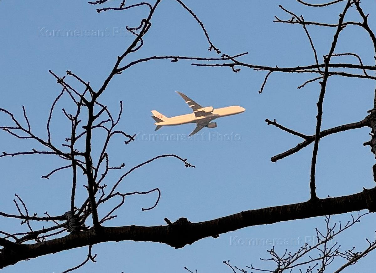 Жанровая фотография. Летящий самолет и ветки дерева.