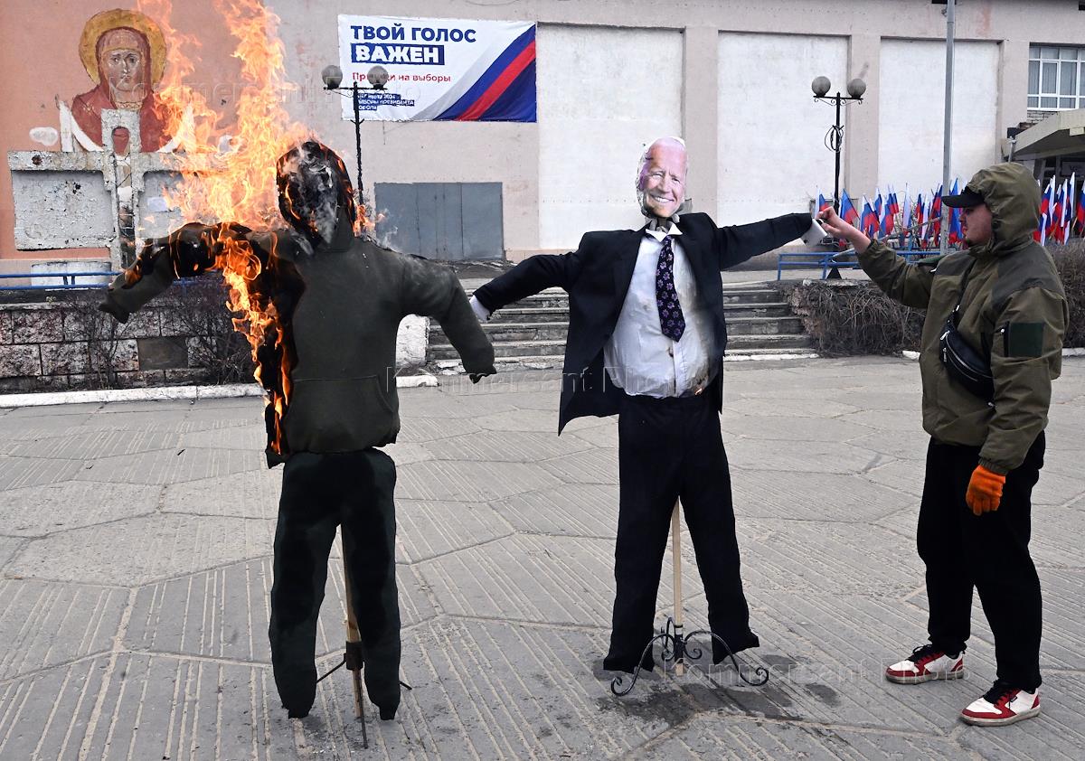 Акция сжигания чучел президента Украины Владимира Зеленского и президента США Джо Байдена в…
