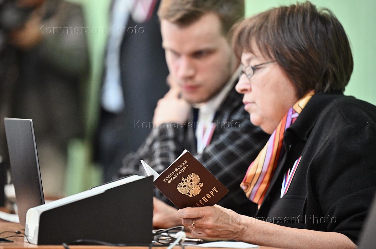 Выборы президента России. Голосование на избирательном участке № 143 ГБОУ Школа № 1574. Сотрудница…