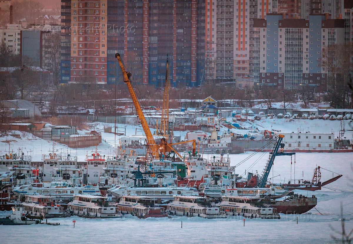 Виды Хабаровска. Жанровая фотография. Порт на реке Амур. Суда во льду на реке.