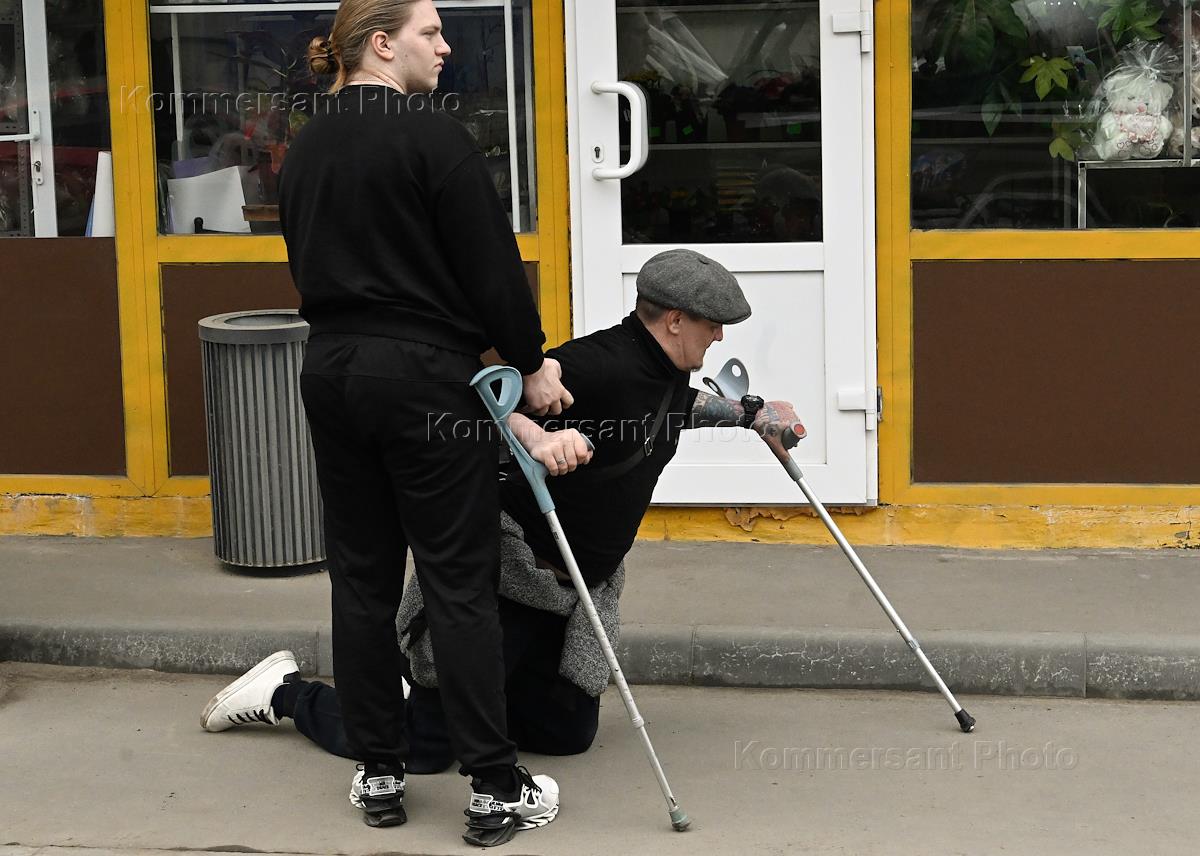 Виды Луганска. Жанровая фотография. Молодой человек помогает встать мужчине на костылях.