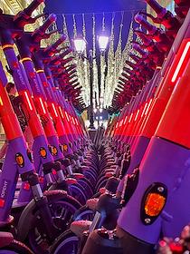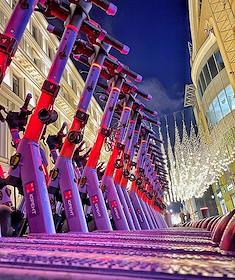 Жанровая фотография. Прокатные самокаты с регистрационными знаками в центре города.