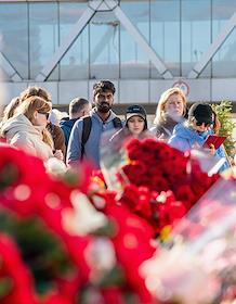 Стихийный мемориал у здания концертного зала "Крокус Сити Холл" после теракта 22 марта 2024 года.