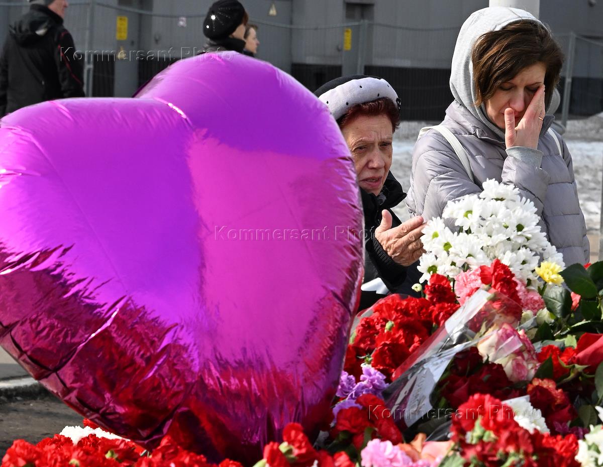 Ситуация у здания концертного зала "Крокус Сити Холл" после теракта 22 марта 2024 года. Цветы у…