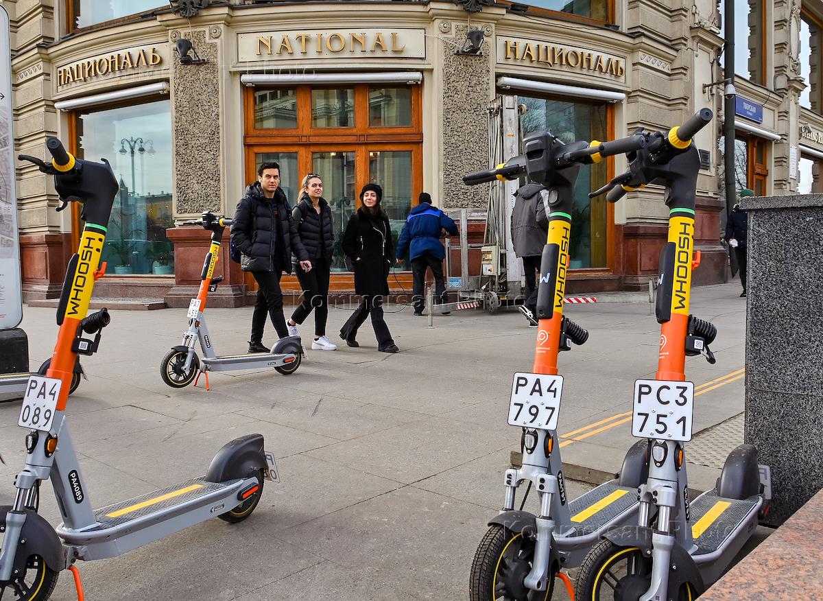 Жанровая фотография. Прокатные самокаты компании "Яндекс GO" с регистрационными знаками на Манежной…