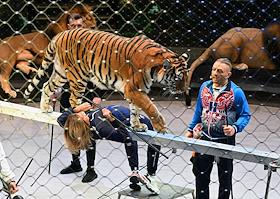 Открытая репетиция в Большом Московском цирке. Тигр во время репетиции.