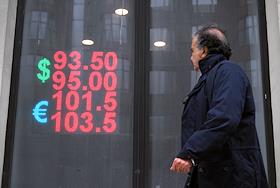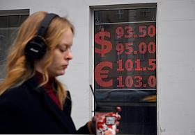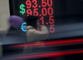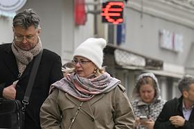 Виды Москвы. Жанровая фотография. Знак евро на световом информационном табло пункта обмена валют.